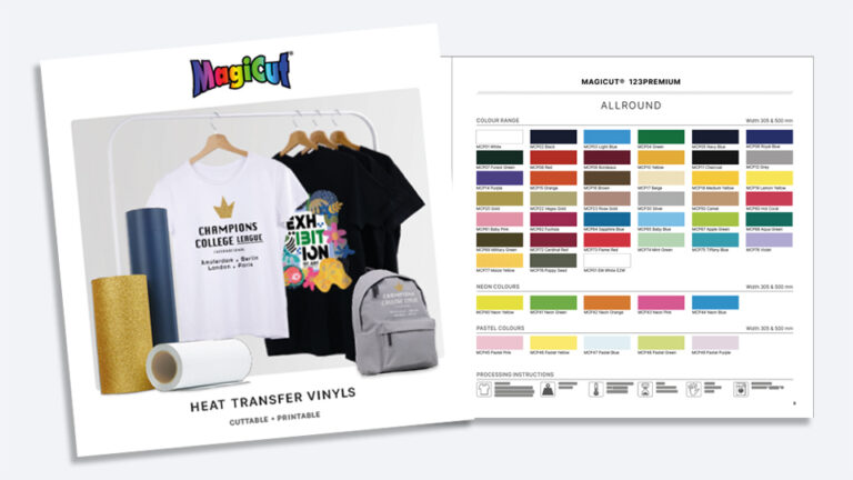 View the MagiCut brochure of 2024 for the latest HTV (Heat Transfer Vinyl colors and the complete series of the MagiCut product portfolio.