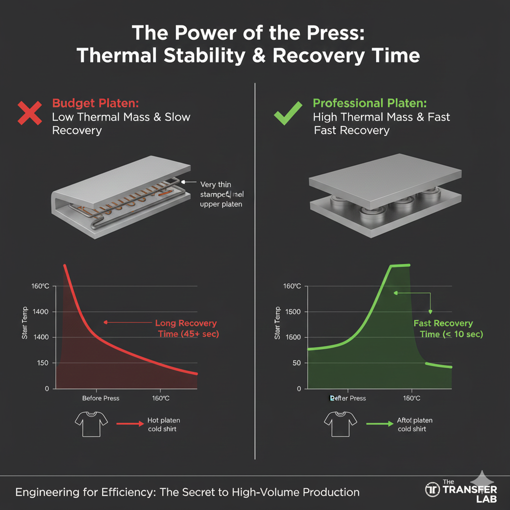 In the garment decoration and heat transfer industry, Recovery Time is the duration required for a heat press’s heating element (the upper platen) to return to its programmed operating temperature after a pressing cycle is completed. When the hot platen contacts a room-temperature substrate—such as a t-shirt, hoodie, or ceramic tile—the substrate acts as a “heat sink,” absorbing thermal energy and causing the platen’s temperature to drop momentarily.