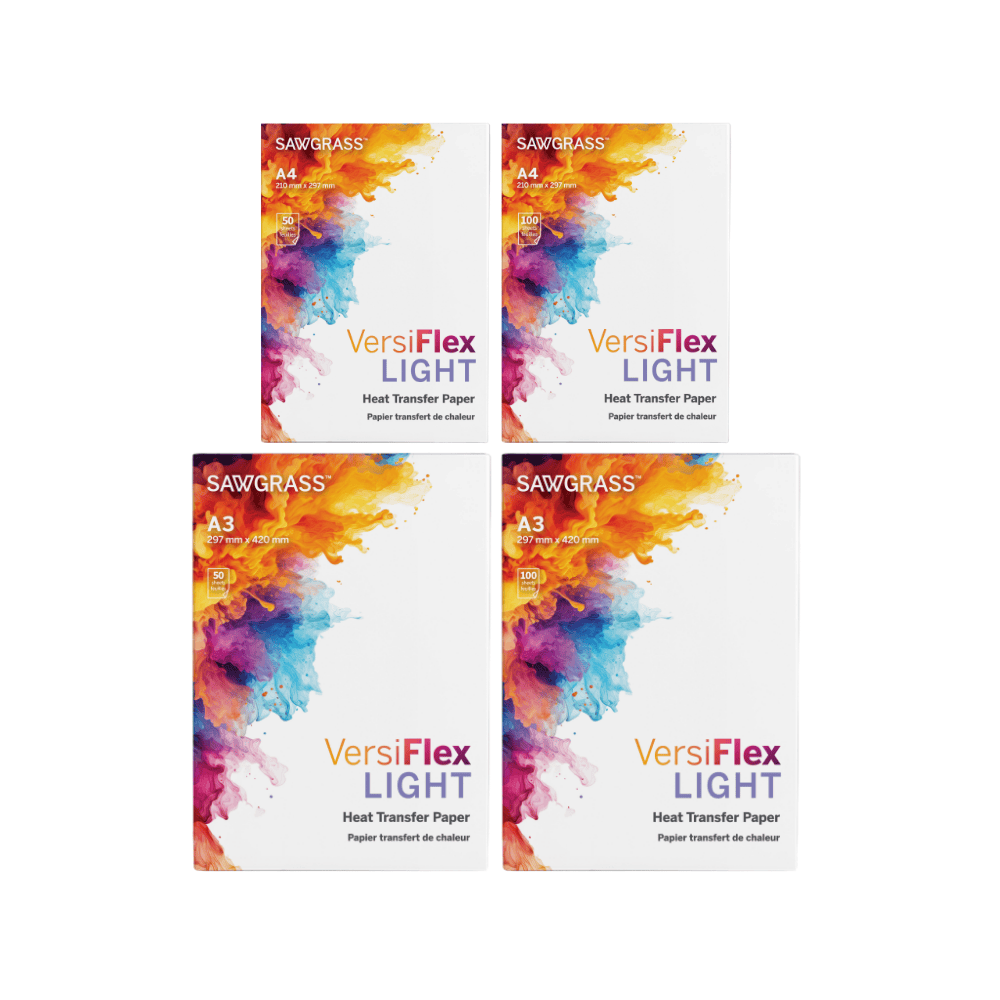 Print your design on any of our VersiFlex approved transfer papers using our trusted Sawgrass printers and innovative VersiFlex ink set.