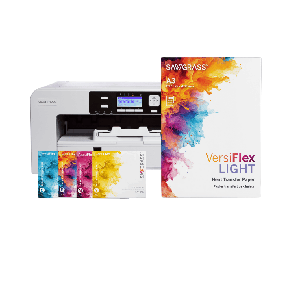 The Sawgrass SG1000 VersiFlex combines the versatility of the SG1000 printer with the innovative VersiFlex technology, enabling high-quality printing on a wide range of materials. The SG1000 printer supports media sizes up to 11″ x 17″ (28 x 43 cm) with the standard tray, and up to 13″ x 19″ (33 x 48 cm) using the optional bypass tray. It utilizes a self-weeding transfer system that eliminates the need for pre-treatment, cutting, or weeding, making it suitable for printing on cotton, uncoated wood, ceramics, and more.