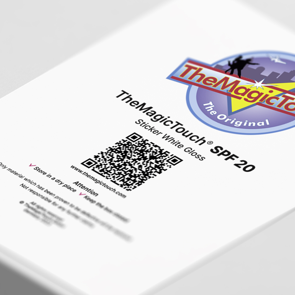 TheMagicTouch SPF20 White Gloss are self-adhesive, printable sticker sheets with which you can create high-quality stickers yourself. You can easily and quickly print any design, logo, or text on the sticker material, suitable for all color laser and LED printers. The stickers are easy to cut to any desired size. SPF20 is water resistant and available in two sizes.